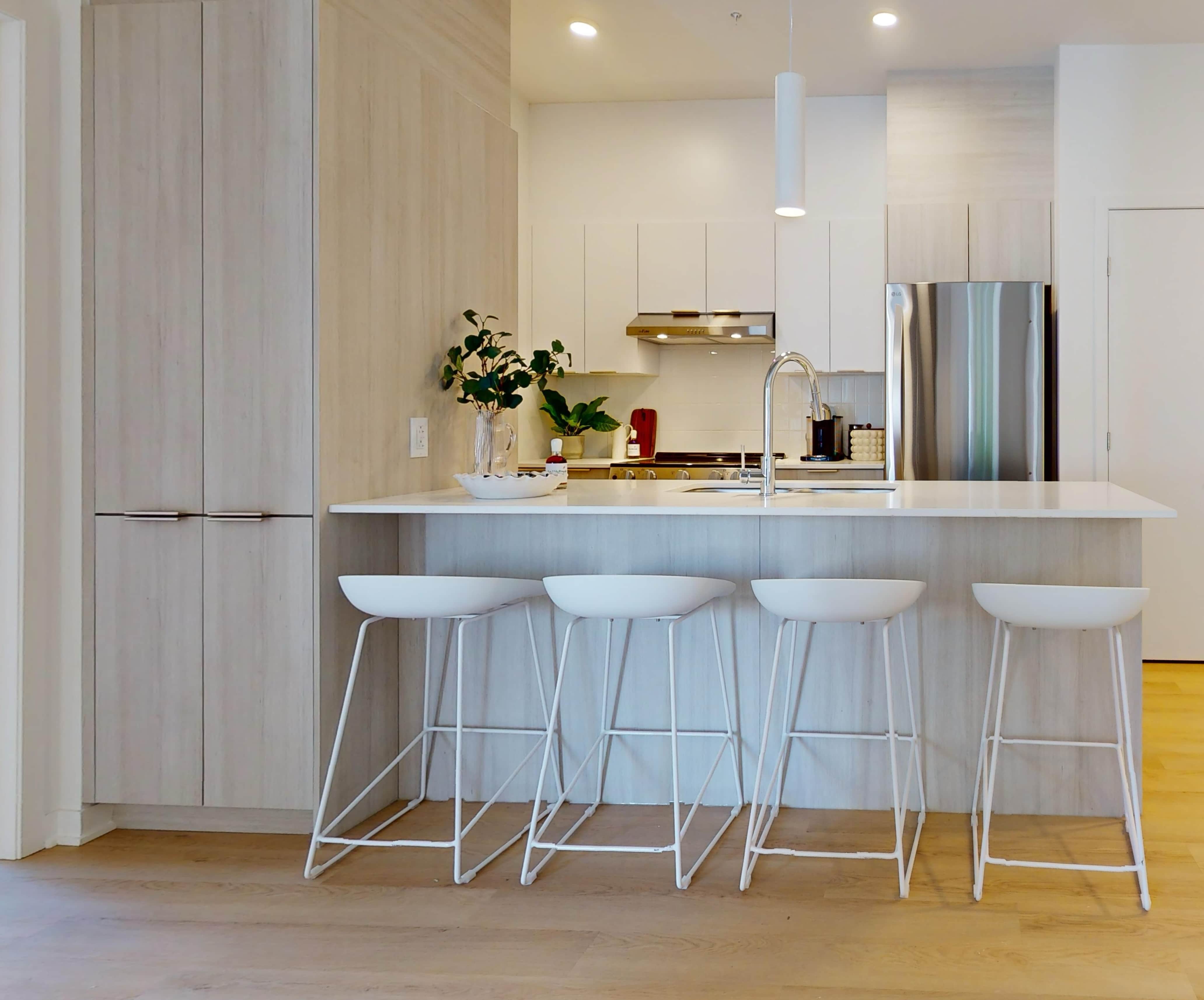 The diverse units promise abundant natural light, contemporary finishes, a modern and spacious bathroom, and an ergonomic, functional kitchen with quartz countertops and islands, and appliances included.